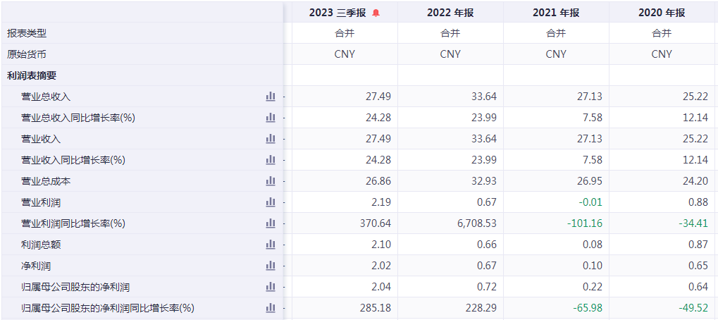 2020年、2021年、2022年及2023年1-9月,公司实现营业收入分别为25.22亿元、27.136亿元、33.64亿元和27.49亿元,净利润分别为0.65亿元、0.10亿元、0.67亿元和2.02亿元,扣非归母净利润分别为0.29亿元、-0.24亿元、0.08亿元和0.37亿元。