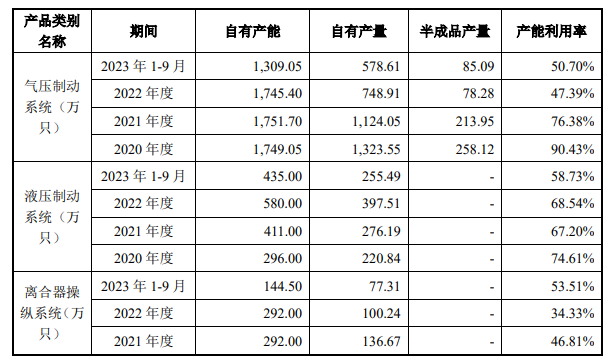 令投资者质疑的是,万安科技产能利用率较低仍然募资扩产是否真的有此必要。数据显示,公司2022年各产品产能利用率均低于70%。2023年前三季度,公司气压制动系统产能利用率为50.70%,液压制动系统产能利用率为58.73%。