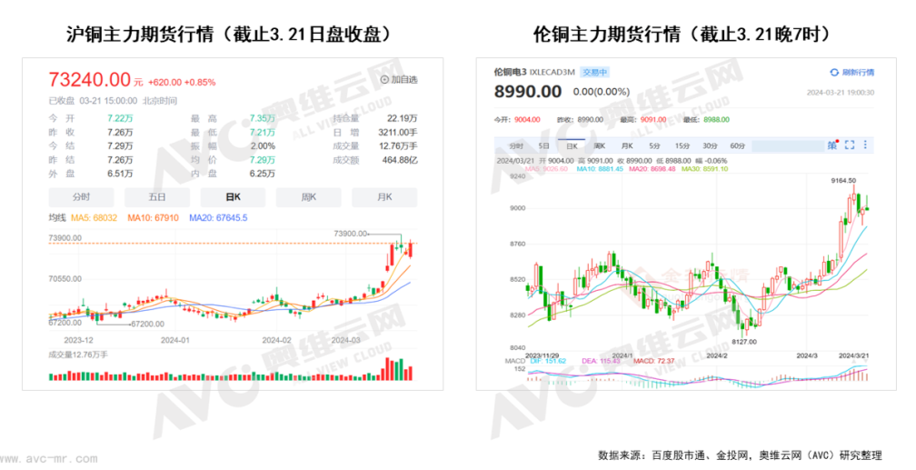 受国内政策预期与美联储降息预期的双重影响,加之矿山供应扰动与国内冶炼厂减产迹象,推动近期铜价上涨,且涨势不止、涨幅惊人。沪铜突破7万元大关后,持续创下2022年5月以来的新纪录,伦敦铜也刷新过去11个月的新高。截止3月21日晚7点,沪铜最高点价格达73900元/吨,伦铜最高价升至9164.5美元/吨。