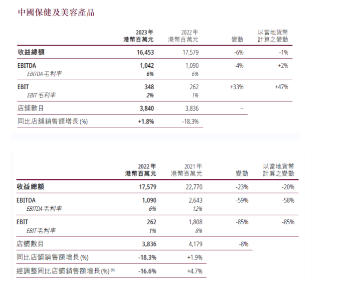 从刚刚公布的2023财年年度业绩报告中可以看到,在中国市场上,屈臣氏集团保健及美容产品的全年收益总额为164.53亿港币(约合人民币151.45亿元),同比下滑6%;EBITDA(注:税息折旧摊销前利润)为10.42亿港币(约合人民币9.59亿),同比下滑4%;EBIT(注:息税前利润)为3.48亿港币(约合人民币3.20亿),同比增长33%;店铺数目为3840家;同比店铺销售额增长1.8%。