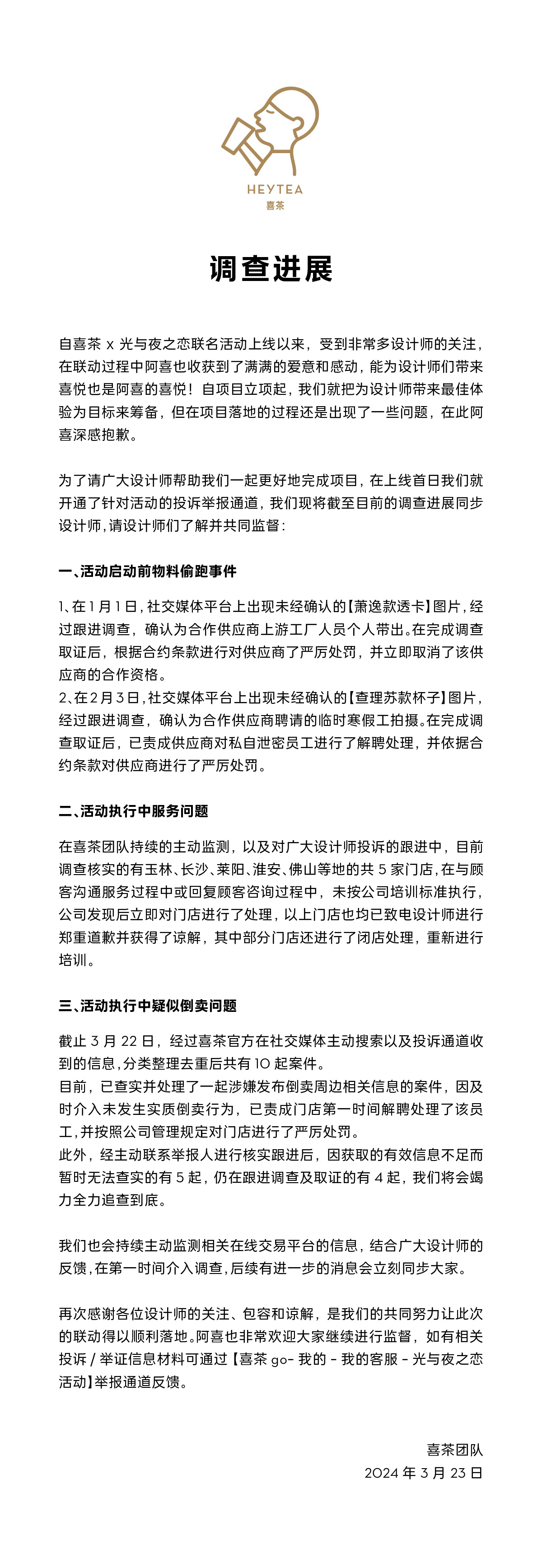 3月23日,喜茶就与光与夜之恋联名活动相关情况发布调查进展,对活动启动前物料偷跑事件、活动执行中服务问题、活动执行中疑似倒卖问题作出回应。喜茶表示,截至3月22日,经喜茶官方在社交媒体主动搜索以及投诉通道收到的信息,分类整理去重后共有10起案件。已查实并处理了一起涉嫌发布倒卖周边相关信息的案件,因及时介入未发生实质倒卖行为,已责成门店第一时间解聘处理了该员工,并按照公司管理规定对门店进行了严厉处罚。此外,经主动联系举报人进行核实跟进后,因获取的有效信息不足而暂时无法查实的有5起,仍在跟进调查及取证的有4起,公司将全力追查到底。