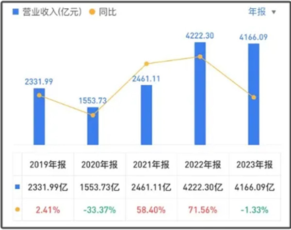历年营业收入对比来看,中国海油2021年、2022年、2023年分别收入2461.11亿、4222.30亿、4166.09亿。前两年实现同比增长,增幅分别为58.40%、71.56%;而2023年营收小幅下降,同比下降1.33%。