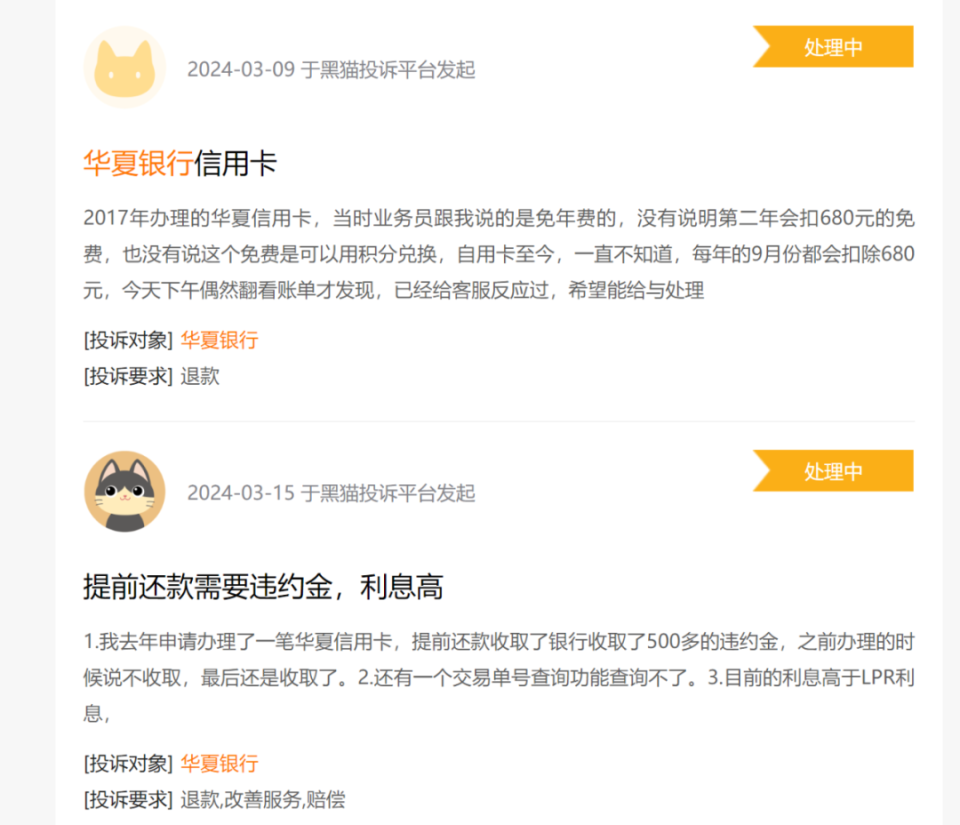 针对频出的投诉问题华夏银行表示:“黑猫平台”并非我中心投诉受理渠道。我行信用卡中心根据《银行业保险业消费投诉处理管理办法》规定,设立了客服热线、来信、来访、微信客服等多渠道投诉受理方式,投诉受理渠道已通过我行信用卡中心网站主页公示,消费者可通过上述渠道投诉信用卡问题。