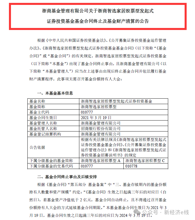 其中,浙商智选家居(A/C)在当天的公告中称,根据《基金合同》“第五部分基金备案”中“三、基金存续期内的基金份额持有人数量和资产规模”约定:“《基金合同》生效之日起满三年后的对应日(自然日),若基金资产净值低于2亿元,基金合同自动终止,且不得通过召开基金份额持有人大会的方式延续基金合同期限。”该基金基金合同生效日为2021年3月19日,基金合同生效之日起满三年后的对应日为2024年3月19日。