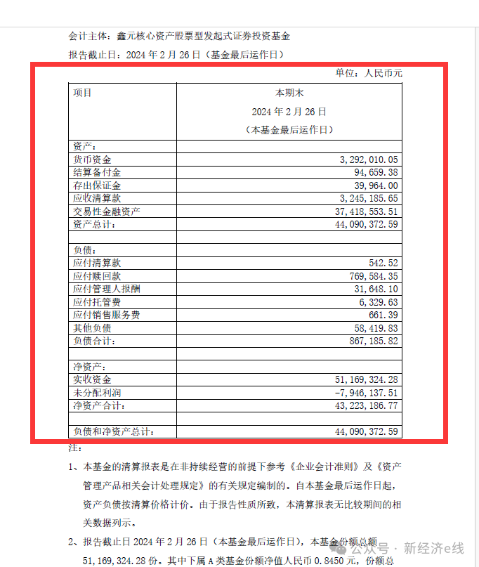 3月14日,鑫元核心资产A发布清算报告称,根据基金《基金合同》第五部分 基金备案”之“三、基金存续期内的基金份额持有人数量和资产规模”的约定:“《基金合同》生效满3年后继续存续的,基金在存续期内连续20个工作日出现基金份额持有人数量不满200人或者基金资产净值低于人民币5000万元的,基金管理人应当在定期报告中予以披露;连续60个工作日出现前述情况的,基金合同将终止并根据基金合同约定的程序进行清算,且无须召开基金份额持有人大会,同时基金管理人应向中国证监会报告并履行相关信息披露程序。法律法规或监管部门另有规定时,从其规定。”