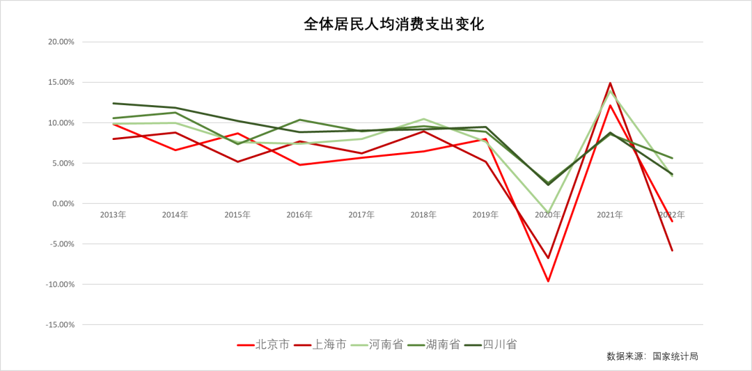 其实,除了在媒体上占据更多声量一线城市以外,在中国看消费,中南、西南地区的“烟火气”也十分值得关注。参考北京、上海、河南、湖南、四川5个省市的全体居民人均消费支出变化,可以看到虽然大趋势趋同,但是总体而言,一线以外的河南、湖南、四川人均消费支出总体增长较快且波动相对平缓——无论发生什么,这些区域依然对于消费有着更强的诉求与渴望。