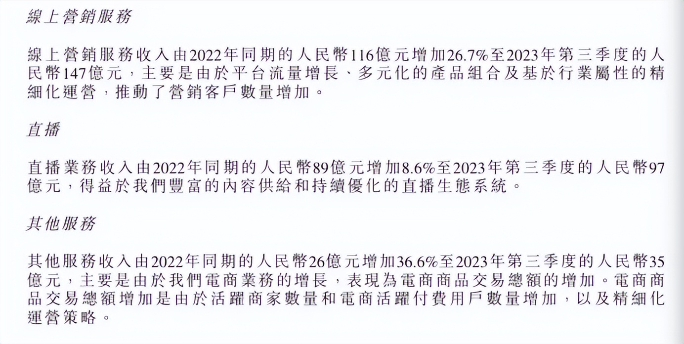 具体分析,其线上营销服务、直播、其他服务三大主营业务,从全年来看也均呈上升态势。其中,快手在线营销服务收入为603亿元,同比增长23.0%;直播业务收入为391亿元,同比增长10.4%;其他服务收入为141亿元,同比增长44.7%。