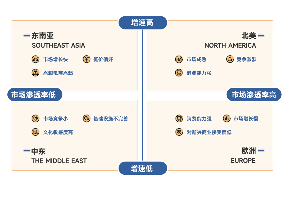 从整体来看,北美市场最成熟、最大,竞争也最激烈;欧洲市场虽然消费力强,物流和支付配套相对成熟,但对商品和交易的规范限制更多,对新兴电商形式的接受程度也更低;东南亚六国(新加坡、菲律宾、印尼、泰国、马来西亚和越南)正在从三年前的“蓝海”迅速变为“红海”,货架电商降速的同时,内容电商成为新的增长引擎;中东三国(沙特、阿联酋和土耳其)市场正在迅速扩大,但短时间内仍无法解决基础设施难题。