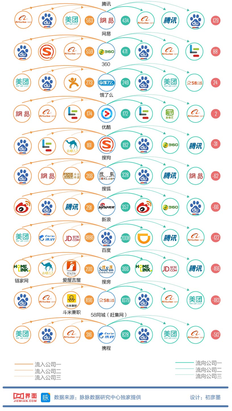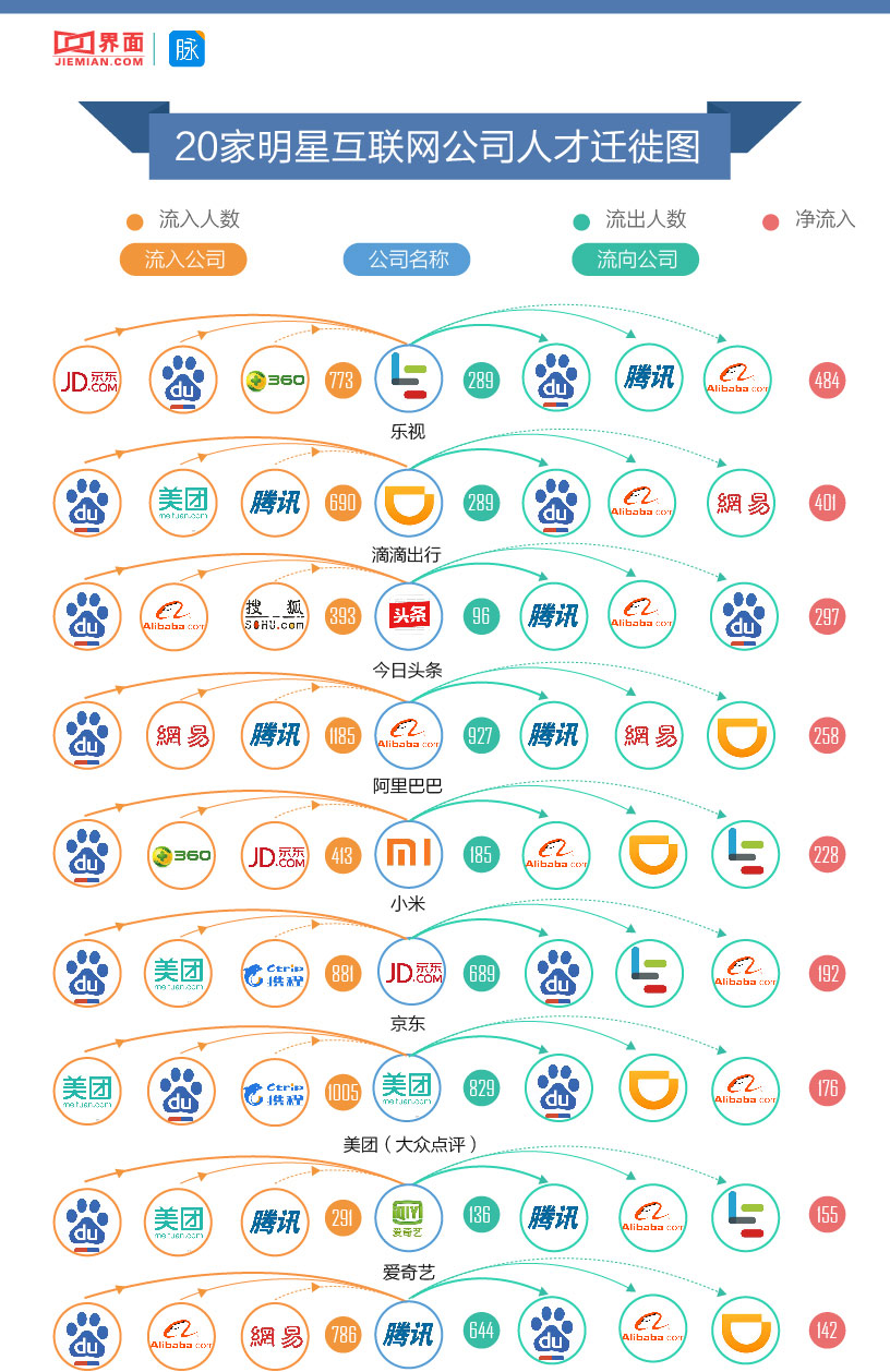 互联网专业人才的数量满足不了市场大规模的需求,所以这个行业工作机会多、薪酬水平高的同时流动性也非常大。作为互联网行业的三大巨头,百度、阿里巴巴、腾讯对于互联网人才有很大的吸引力,他们的员工也是众多互联网同行觊觎的资深工程师、管理者人选。根据脉脉数据研究院独家提供给界面新闻的数据,我们制作了一份明星互联网公司人才迁徙图表,通过采访进一步验证数据所呈现的趋势,并总结了7个有趣的发现。