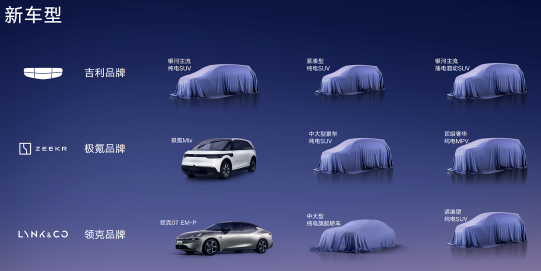 进入2024年,吉利三大新能源品牌还将各自推出3款新车型,包括吉利银河系列的2款纯电SUV和1款插电混动SUV,极氪系列的Mix 纯电创新车型、1款豪华纯电 SUV和1款奢华纯电 MPV,以及领克系列的1款插电混动轿车和1款纯电轿车、1款纯电SUV。