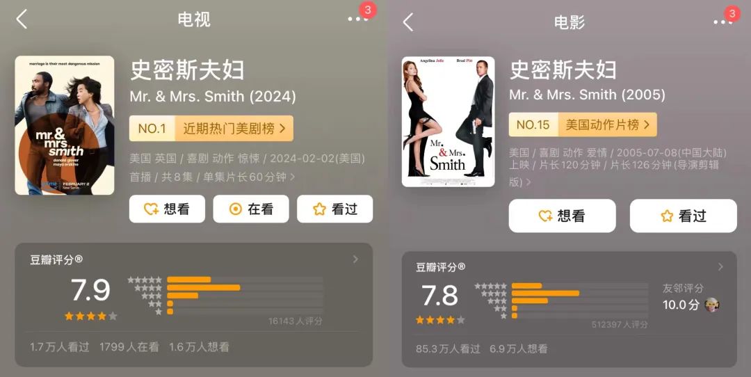主创团队在原作的基础上,拓展故事深度,从电影体量扩充为电视剧,在原有的故事情节上,挖掘婚姻本质和生活症结,契合了当下观众情绪。翻拍后的《史密斯夫妇》,烂番茄指数90%,国内豆瓣评分也已经超过了原作。