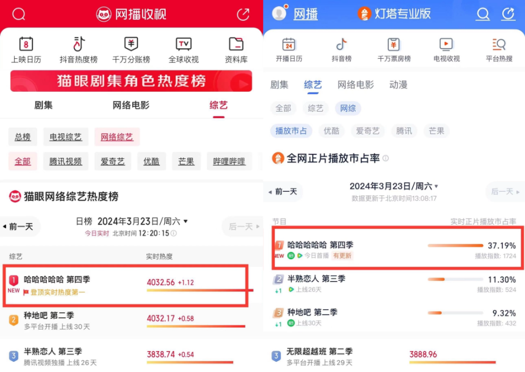 而新一季首期节目上线后,播映数据方面,《哈哈哈哈哈》第四季同时拿到猫眼网综实时热度 TOP1、猫眼全网实时热度 TOP1、灯塔网综实时热度榜 TOP1以及灯塔全网实时热度榜 TOP1;热度与口碑方面,第一季诸多开局名场面推动 #邓超背着孙俪在家干这事#、#鹿晗宝石老舅王勉被范志毅偷家#、#鹿晗腹肌没了# 等话题冲上微博热搜榜前TOP6,首播热度较上一季大幅增长,足见观众对《哈哈哈哈哈》系列持续的热情追随。