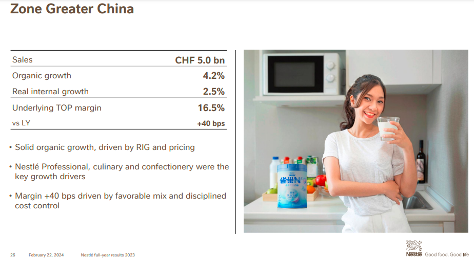 根据雀巢最新财报,2023年全年,雀巢集团的有机增长率达到7.2%,定价贡献率达到7.5%。其中,雀巢大中华大区有机增长率4.2%,其中实际内部增长率(注:相当于销量贡献率)2.5%,定价贡献率1.7%。