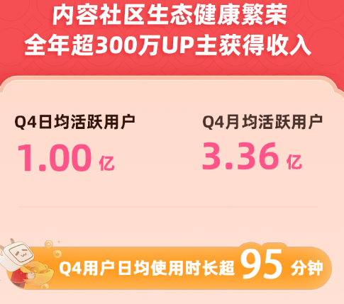 同时,根据财报显示,B站视频投稿量还在保持增长,较三季度月均2100万的视频投稿量,去年第四季度B站月均投稿量超2300万。