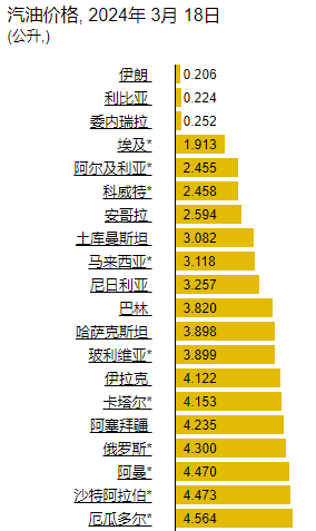 以2024年3月18日的全球汽油价格为例,从全球来看,在世界169个国家(地区)的汽油价格中(按从低到高的顺序排列),中国大陆处于第61位。