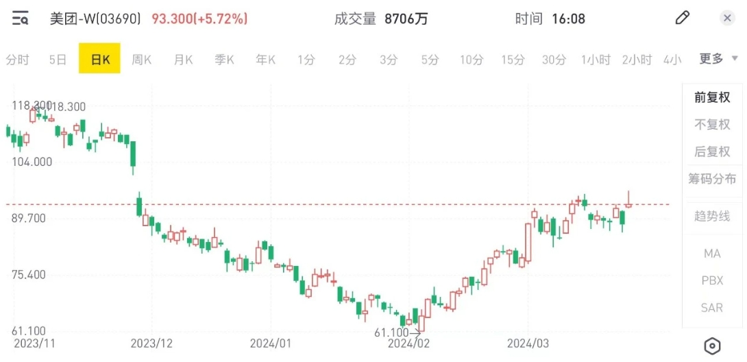 图:美团股价走势图,来源:老虎证券 《听筒Tech》截图