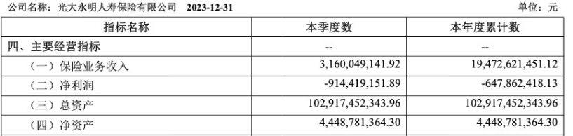 转折点发生在2022年,光大永明人寿营业收入199.69亿元,亏损约13.57亿元;2023年其营业收入下降为194.73亿元,亏损约6.48亿元。换言之,最近两年光大永明人寿亏损已达20亿元。