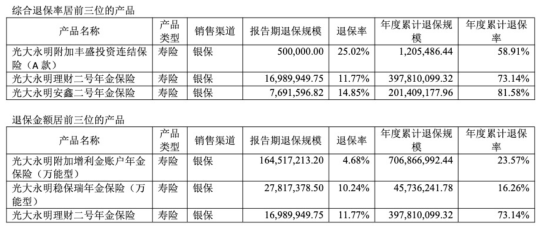 业绩的亏损,绕不开居高的退保率及退保金额。光大永明人寿偿付能力报告显示,2022年,光大永明附加光明财富年金保险A款(分红型)、光大永明光明财富年金保险A款(分红型)两款产品的退保率已超过85%,该年光大永明人寿退保金额居前三位的产品累计退保约19.73亿元;2023年,光大永明安鑫二号年金保险的退保率超过80%,其退保金额居前三位的产品累计退保约11.5亿元。