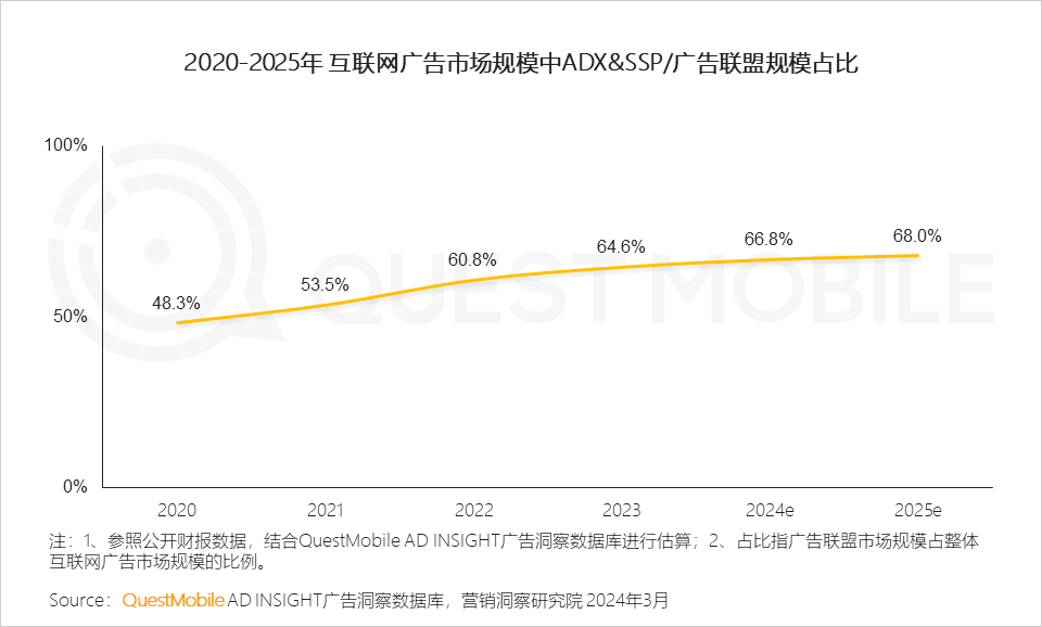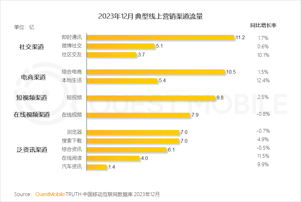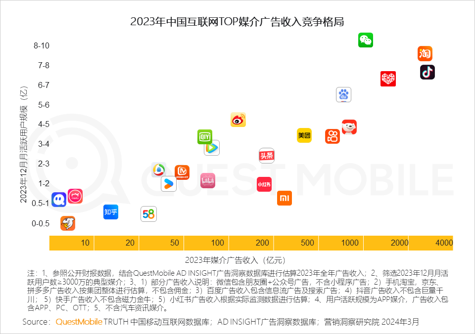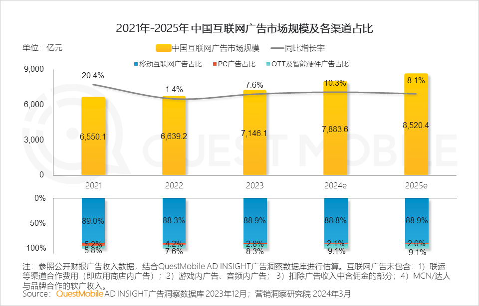 QuestMobile数据显示,随着消费提振、线上消费稳步增长,过去一年,数字营销快速发展,互联网广告市场规模达到7146.1亿元,同比增长7.6%,预计到2024年这一数字将进一步提升至7883.6亿元,增速也将提升至10%以上。