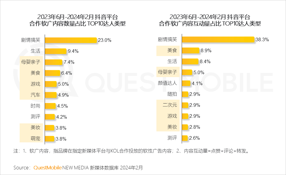 此外,二次元、游戏等垂类达人软广内容的互动量占比跻身TOP10行列,用以影响更年轻人群。