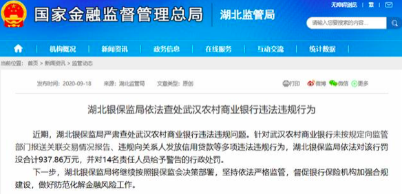 此外,2020年9月,武汉农村商业银行因存在未按规定向监管部门报送关联交易情况报告、违规向关系人发放信用贷款等21项违法违规行为,被原湖北银保监局罚没937.86万元,并对14名责任人员给予警告。该行时任法定代表人(主要负责人)为徐小建。