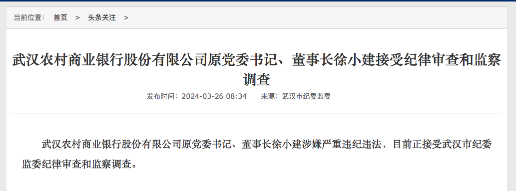3月26日,据武汉市纪委监委消息,武汉农村商业银行股份有限公司(下称武汉农商行)原党委书记、董事长徐小建涉嫌严重违纪违法,目前正接受武汉市纪委监委纪律审查和监察调查。