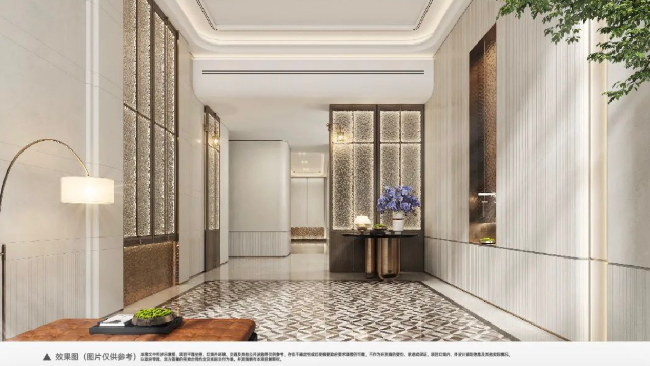 而定制化的双入户大堂则采用将建筑风格和空间肌理的细节融合,雕琢金属与石材材质的和谐尺度,营造了一个充满艺术感且舒适的归家体验。