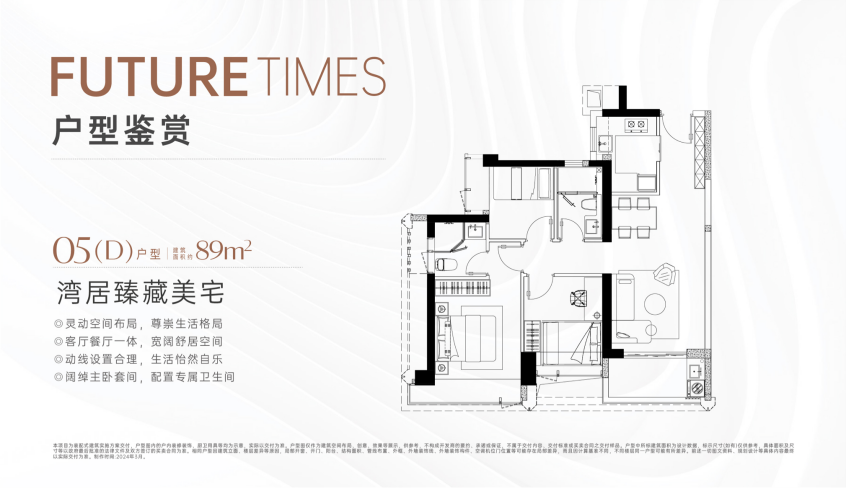 89平小户型产品,户型方正,结构与功能间布局也较为合理。主卧配有专属卫生间,尊奢的套房设计,私密、舒适度极高。在不到90平的空间内做到了3房2卫设计,足以看到开发商的诚意。