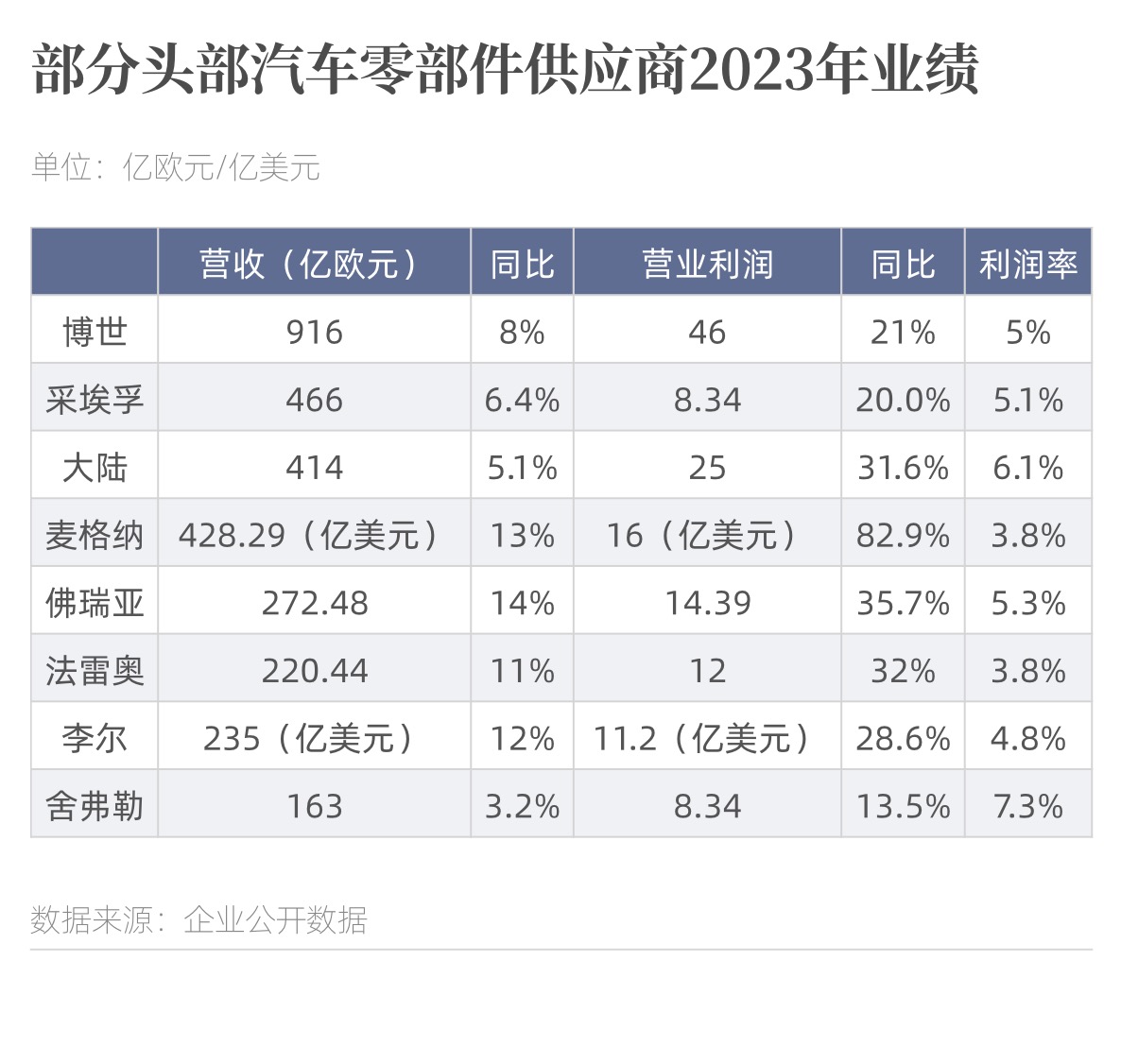 值得注意的是,尽管汽车供应商营收实现增长,但营收排名前二十的零部件公司中利润率最高未超过8%,博世仅为5%。