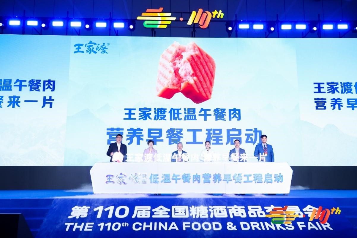 大会现场,世界冠军获得者杨扬;农业农村部食物营养所健康指导中心主任李海燕;眉州东坡集团董事长王刚;艾媒咨询合伙人、运营中心总监麦伟杰;四川王家渡食品股份有限公司董事、总经理李鹏,副总经理王路明上台,共同助力王家渡低温午餐肉营养早餐工程启动。