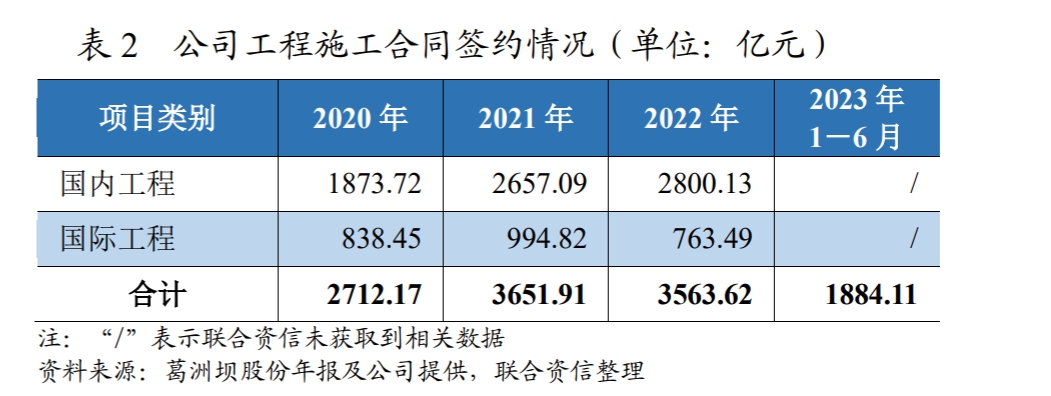 根据债券信用评级报告,截至2023年6月底,葛洲坝集团工程建设业务在建项目在手合同额4012.08亿元。从历年合同签约情况来看,国内工程占比较高,2022年约为八成。