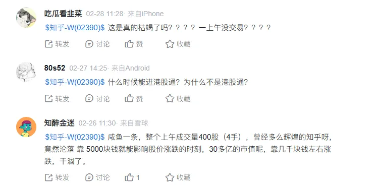 今年2月,知乎港股股价陷入了一阵交易低迷。在雪球社区上,有股民表示:“一上午没交易?”