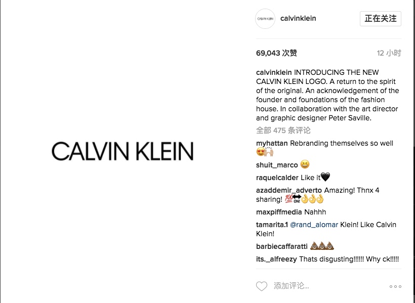 Calvin Klein在Instagram上公开了新Logo的样式,相比之前沿用了40余年的老版本(期间有小幅度调整),新版本最大的改变是全大写的格式,字体样式和间距亦有调整。