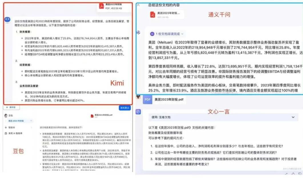 从测试结果来看,正如张强所言,Kimi对文档的归纳总结功能明显优于其他几家大模型。对这份财务报告,Kimi的总结清晰且简明扼要,豆包和通义千问虽然也能总结,但结果呈现并不理想,而文心一言则需要进一步的指令。