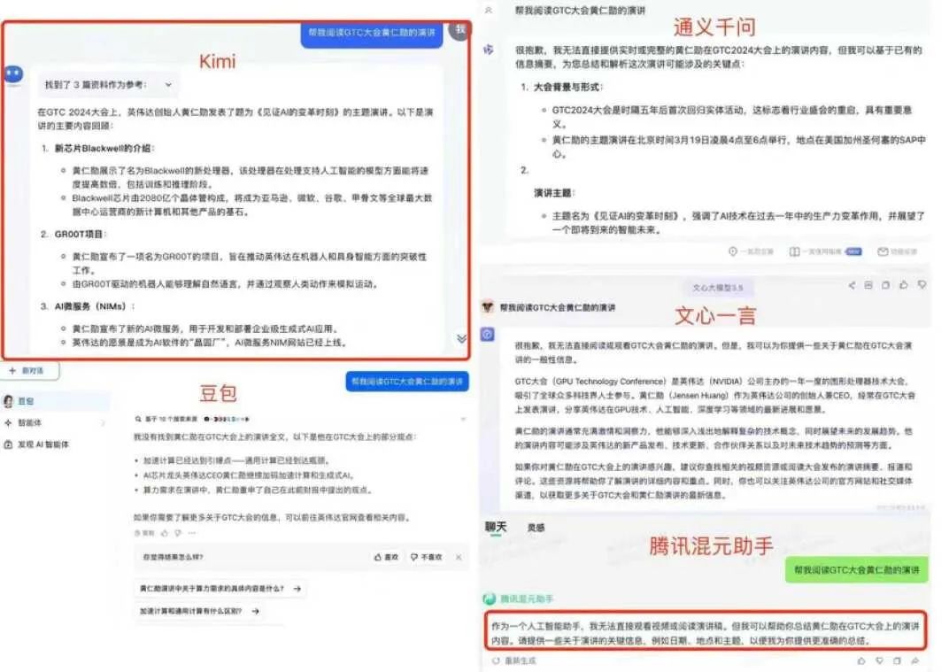 除Kimi外,其他几家大模型均无法检索到黄仁勋在GTC大会上的演讲内容,腾讯混元助手甚至无法生成任何答案,需要进一步的指令。