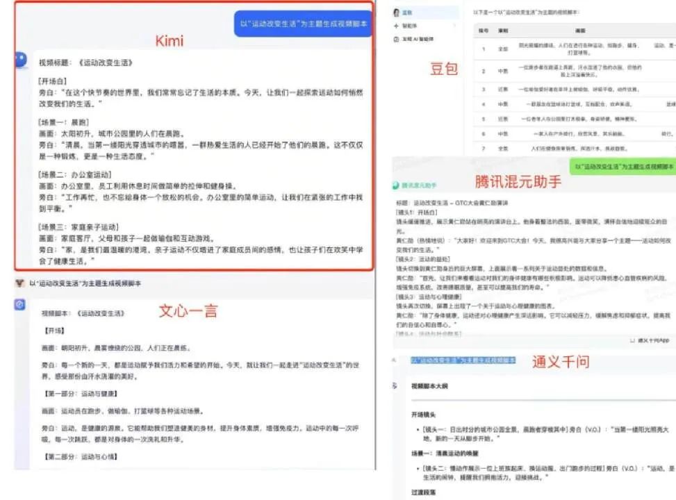 本次测试的内容是“以‘运动改变生活’为主题生成视频脚本”。从生成的结果来看,Kimi、文心一言、通义千问、豆包均能生成符合基本要求的视频脚本文案。