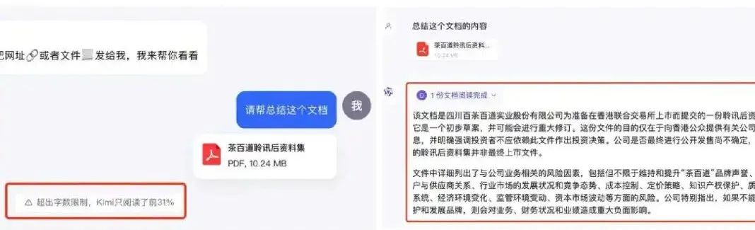 因目前尚未获得200万字的内测资格,《听筒Tech》对Kimi与通义千问分别提交了一份近35万字的《茶百道聆讯后资料集》,发出相同的指令后,kimi反馈“超出字数限制,只阅读了前31%”,而通义千问顺利对全文进行了总结。
