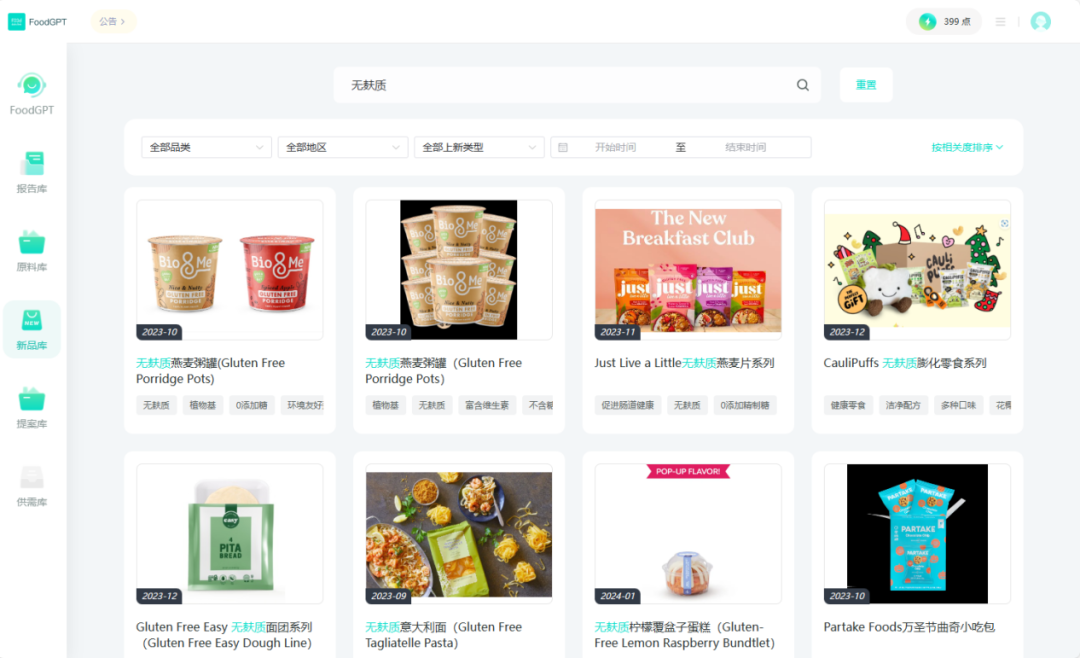根据FoodGPT新品库中所收录的产品信息显示,近一年,无麸质食品常见的主要原料主要包括鹰嘴豆粉、藜麦粉、杏仁粉、奇亚籽粉、南瓜粉、杏仁粉等,涉及烘焙、饮料等领域。
