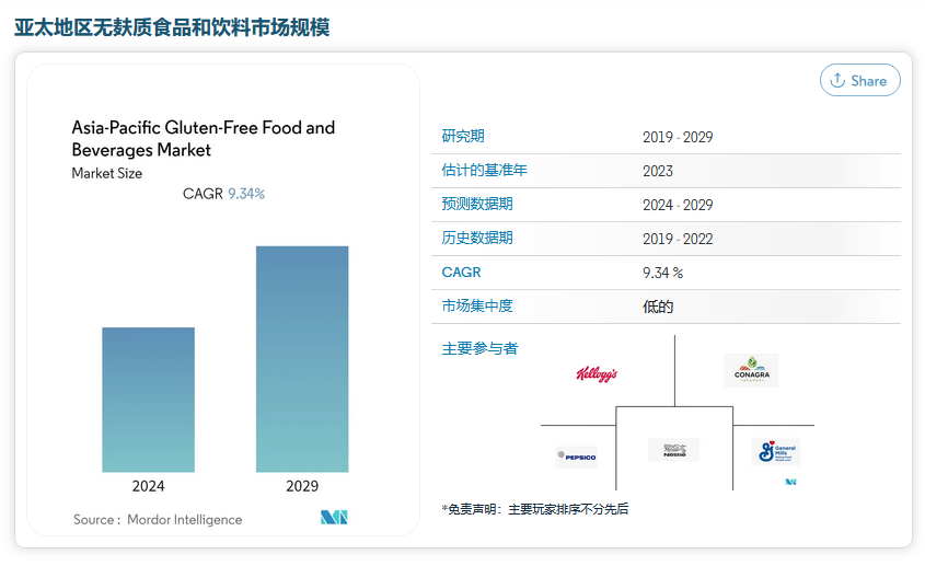 纵观整个亚太区,根据Mordor Intelligence发布的亚太地区无麸质食品和饮料市场规模和份额分析报告数据预测,到2024—2029年期间内无麸质食品和饮料的复合年增长率为9.34%。目前,亚太地区无麸质食品品牌市场集中度较低,澳大利亚是亚太地区最大的无麸质市场。