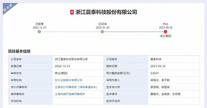 晨泰科技在2022年12月向创业板提交IPO申请。深交所对该公司进行过二轮问询,内容包括创业板定位、关联方债务担保与独立性等。2023年9月,晨泰科技及保荐人东兴证券撤回上市申请文件,IPO终止审核。