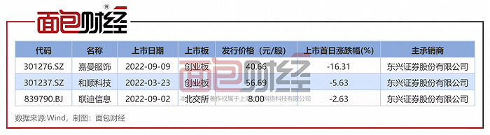Wind数据显示,2022年以来,东兴证券保荐上市的新股中,3只新股在上市首日破发。嘉曼服饰上市首日破发超16%,和顺科技、联迪信息在首日破发超2%。