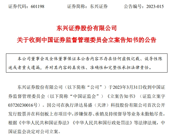 2023年4月,东兴证券披露公告称,因公司在执行泽达易盛(天津)科技股份有限公司首次公开发行股票并在科创板上市项目中,涉嫌保荐、承销及持续督导等业务未勤勉尽责,根据《中华人民共和国证券法》、《中华人民共和国行政处罚法》等法律法规,中国证监会决定对公司立案。