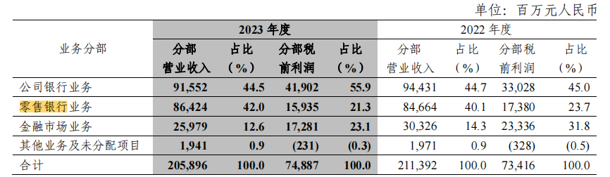 截至2023年末,中信银行零售管理资产规模突破4万亿,私行管理资产站上万亿台阶,零售板块营收864亿元,对该行的营收贡献提升42%,较上年提升1.9个百分点,但对利润贡献占比较2022年的23.7%下降至21.3%。这也意味着,尽管中信银行增加了零售的投入,但零售板块的利润贡献却低于公司板块以及金融市场板块。