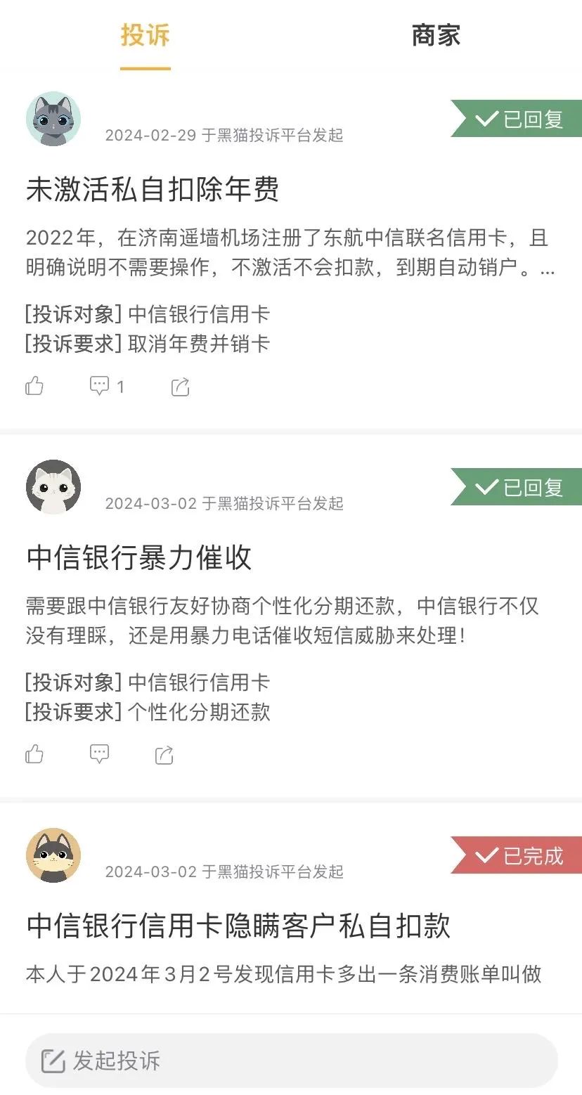 对上述行为该用户在黑猫平台进行了投诉,联系他的是催收人员,但被这位用户认为该行并未有效解决这一投诉。