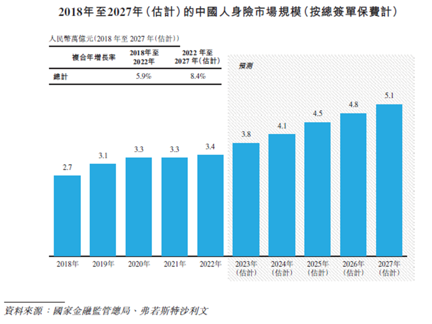 在市场前景方面,根据招股书描述,按照总签单保费计算,中国的人身险市场规模从2018年的人民币2.7万亿元增至2022年的3.4万亿元,复合年增长率5.9%。预计到2027年,中国人身险市场规模将达到5.1万亿元,2022年至2027年的复合年增长率为8.4%。