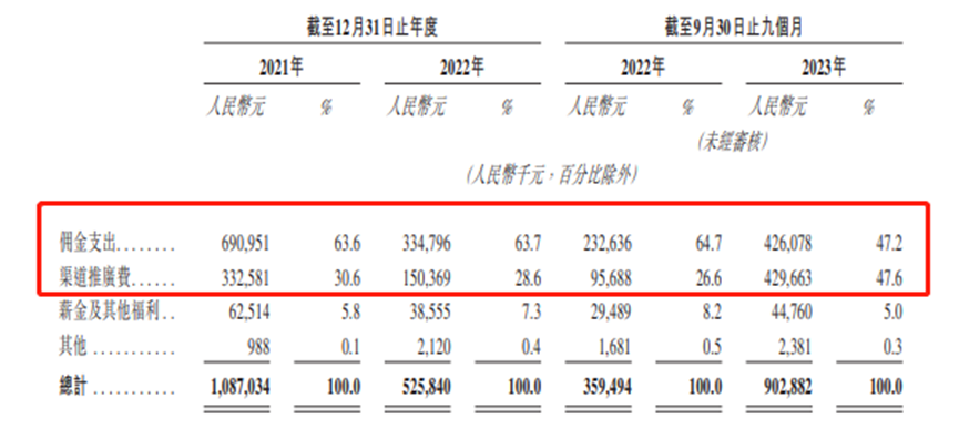 从营业成本来看,2023年前三季度,公司向保险代理人等支付的佣金占营业成本的比例为47.2%,向自媒体等流量渠道支付的渠道推广费占比47.6%,合计占比94.8%。