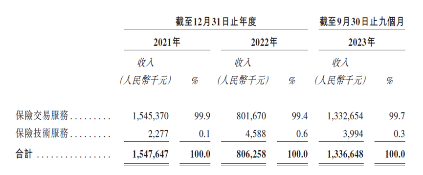 从招股书提供的财务数据来看,手回科技的营收包括保险交易服务与保险技术服务,从收入占比来看,保险交易服务的营收占比超过99%。保险技术服务营收占比仅0.3%,科技成色不足。