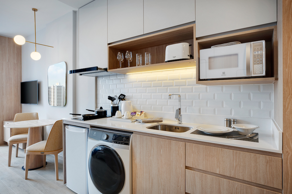 长住酒店最重要的当属设施全面的客房,这里是长住客人居停时间最长的空间,需要同时满足睡眠、办公、洗漱、做饭等功能。Staybridge Suites曼谷通罗区酒店拥有 303 间套房,居住面积有28-62平米不等,房型包含两卧、一卧、双床、大床等。