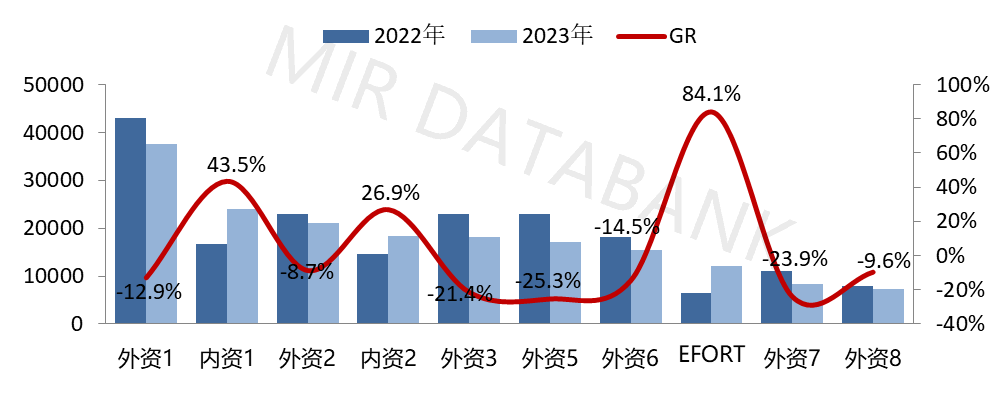 值得关注的是,根据MIR DATABANK数据显示,2023年有3家国产厂商以销量过万的优秀成绩进入工业机器人TOP10行列,其中埃夫特增速最高,达到了84.1%。