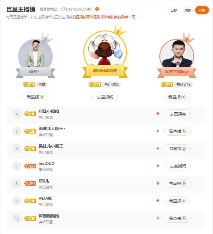 (斗鱼3月巨星主播榜)